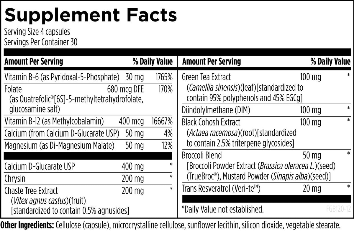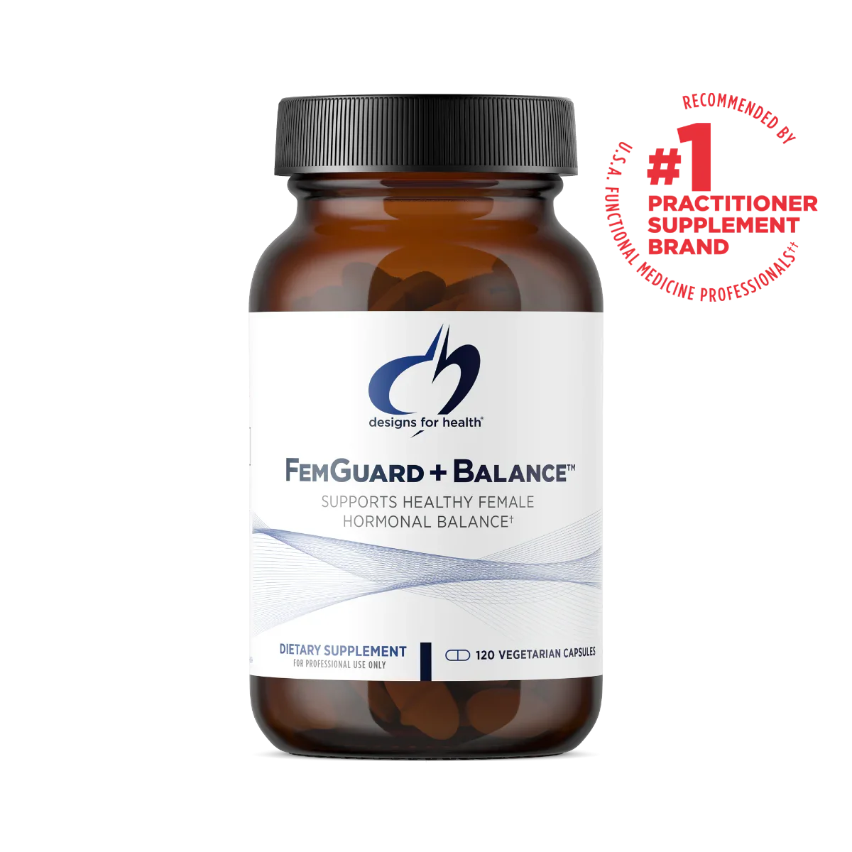 FemGuard + Balance™ targets female hormonal balance by providing chaste tree extract and black cohosh, along with diindolylmethane (DIM) and chrysin to help promote normal estrogen aromatase activity.* Calcium-D-glucarate promotes the proper elimination of excess estrogens.* Standardized broccoli seed and mustard seed extract provide sulforaphane glucosinolate and myrosinase enzyme, respectively, to promote maximal conversion to the beneficial compound sulforaphane, which supports normal detoxification pathways and estrogen metabolism.* Vitamins B6, B12, and folate promote proper cell differentiation.* Magnesium and calcium are included to help support bone and hormone health. Standardized trans-resveratrol and EGCG from decaffeinated green tea are phytonutrients that support overall antioxidant status.