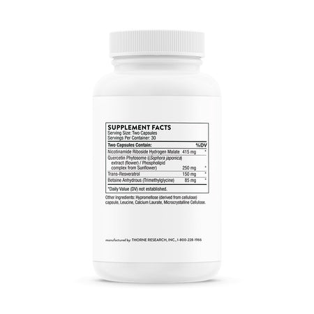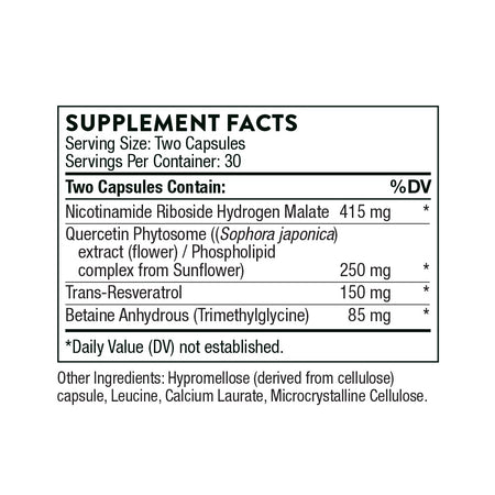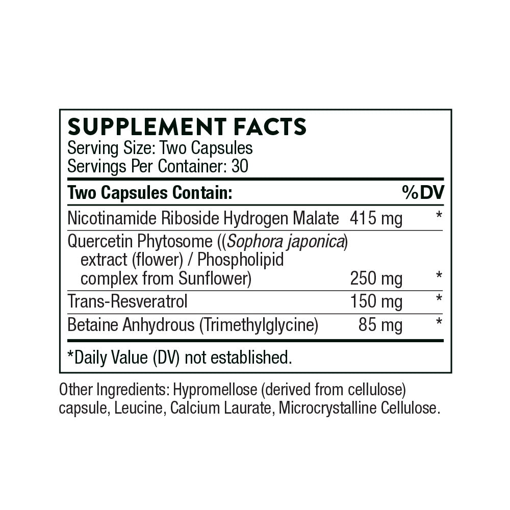 What you should know: Features a synergistic blend of nicotinamide riboside, resveratrol, quercetin phytosome, and betaine to activate sirtuin proteins, support healthy methylation, and help maintain metabolic wellness. This formula is gluten-free, dairy-free, and soy-free, and is third-party tested for quality and purity.