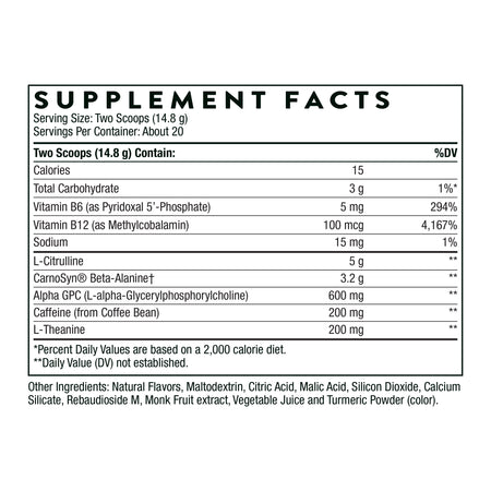 Thorne’s Advanced Pre-Workout is designed to help you get the most out of each workout with science-backed doses of alpha-GPC, beta-alanine, L-citrulline, L-theanine, and caffeine to help you see noticeable benefits in your performance.*